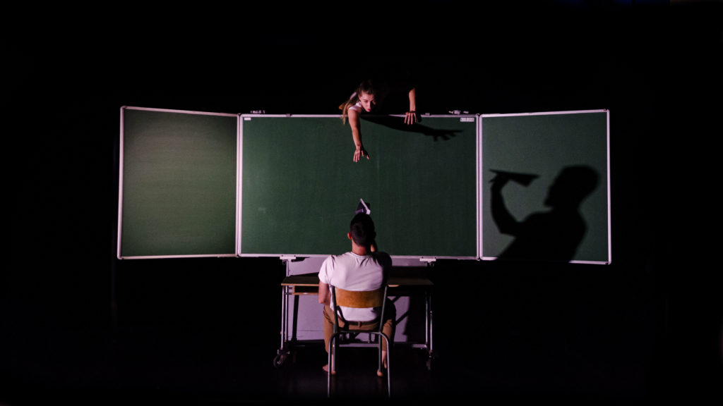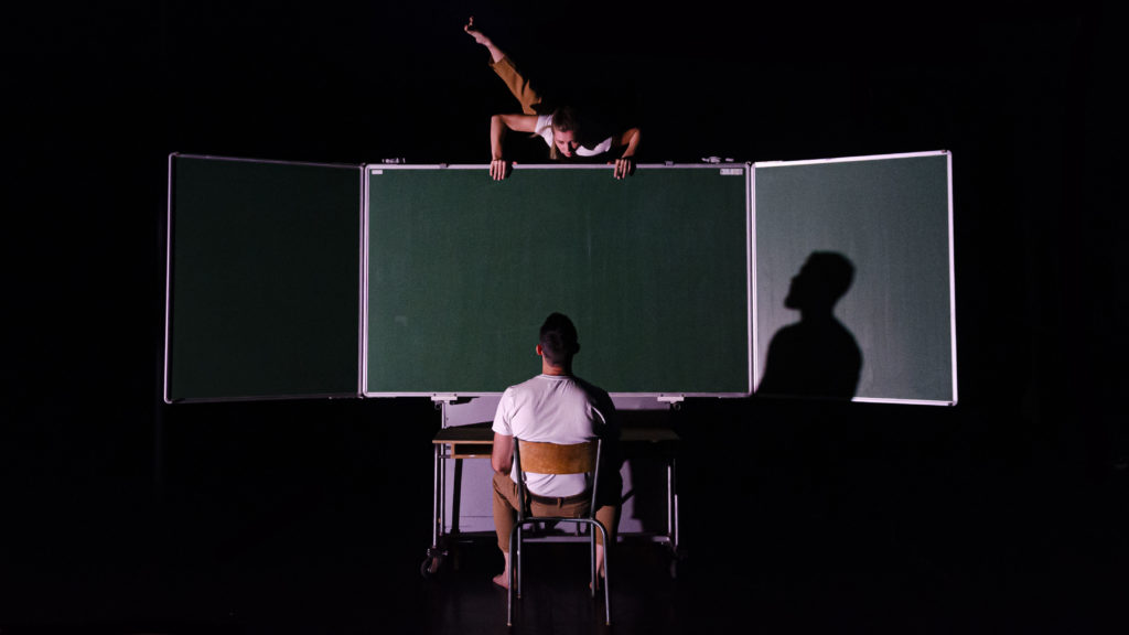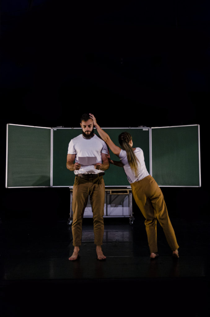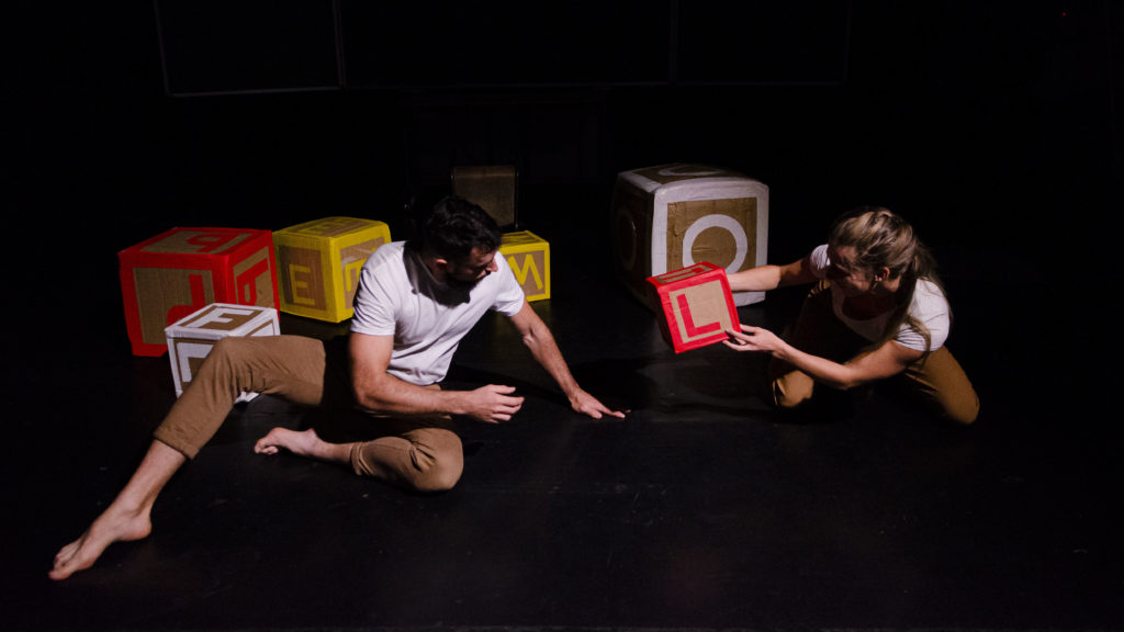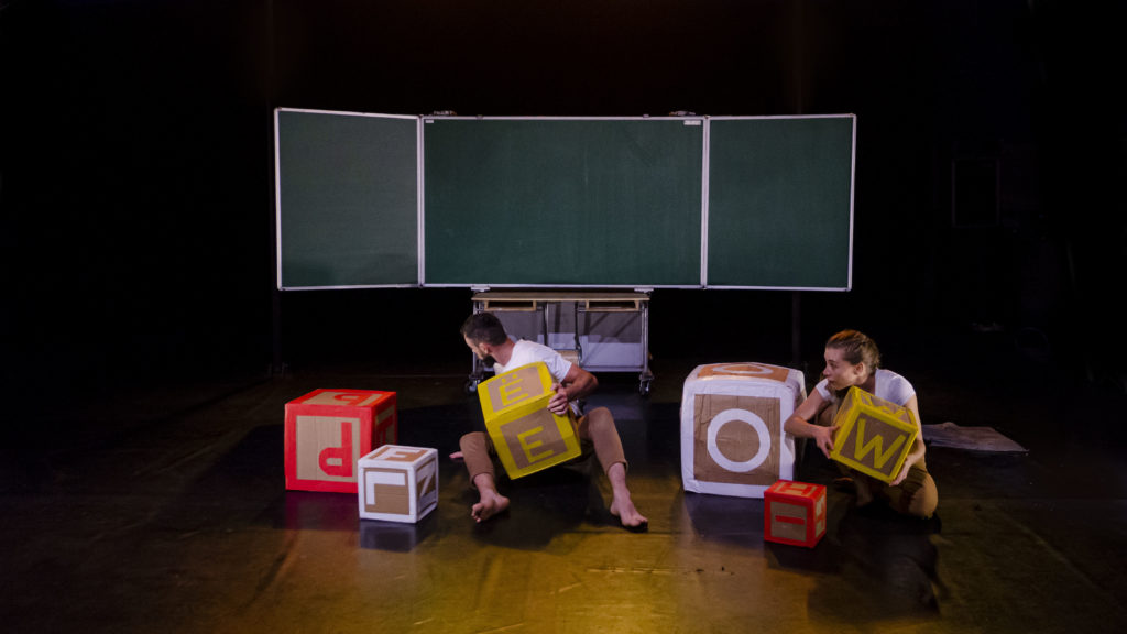 Ce spectacle nous emmène dans la tête et le corps d’un personnage qui exprime physiquement ce qu’il ne parvient pas à écrire. Tout au long du spectacle il est suivi de prêt par son handicap qui le définit : la dyslexie .